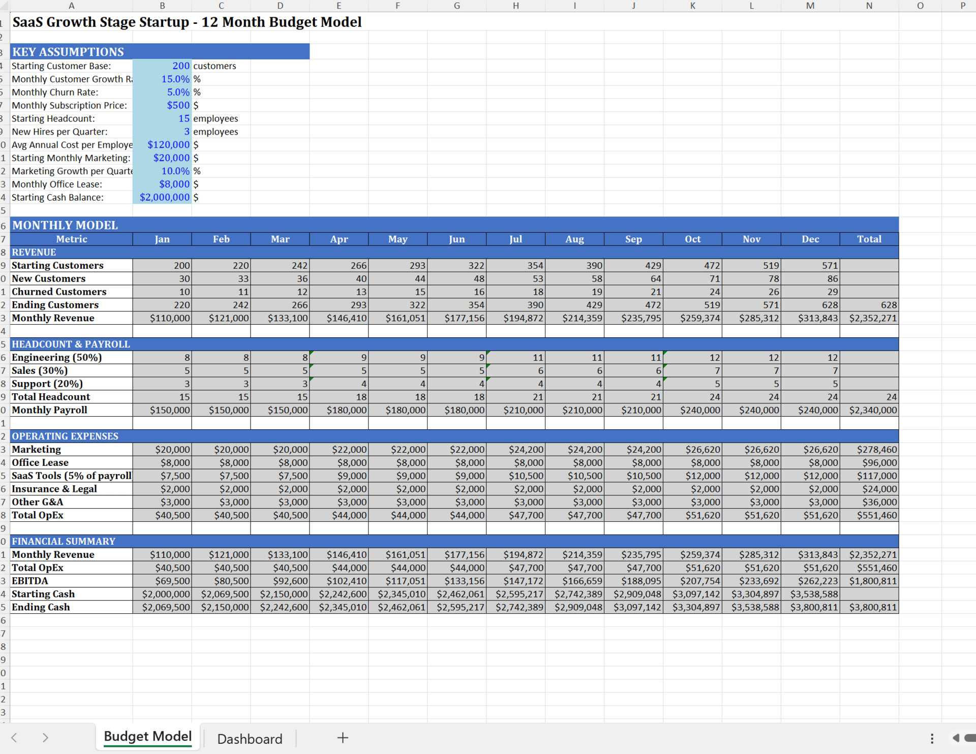 "Create a 12-month budget model in spreadsheet format for a SaaS growth-stage startup.