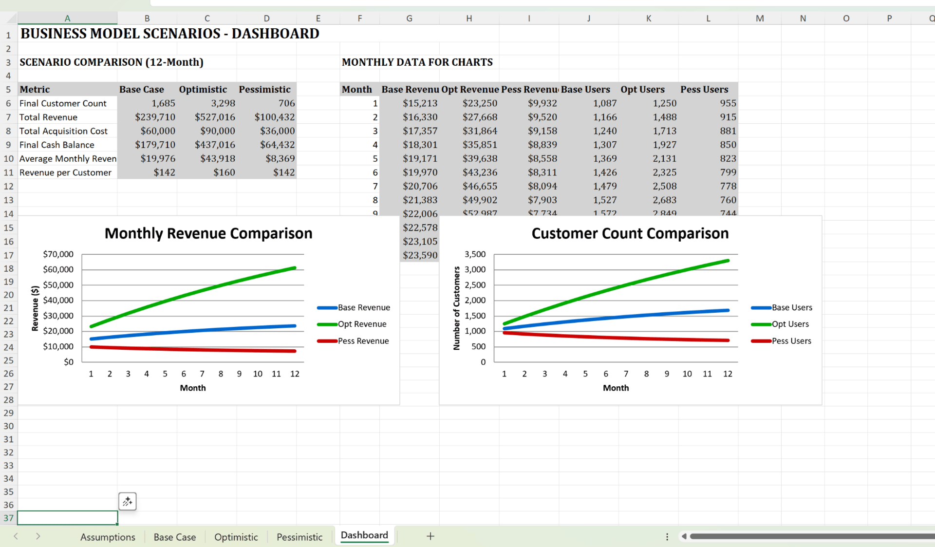 Dashboard tab: visual comparison of scenarios with charts for revenue, customer count, and ending cash balance"
