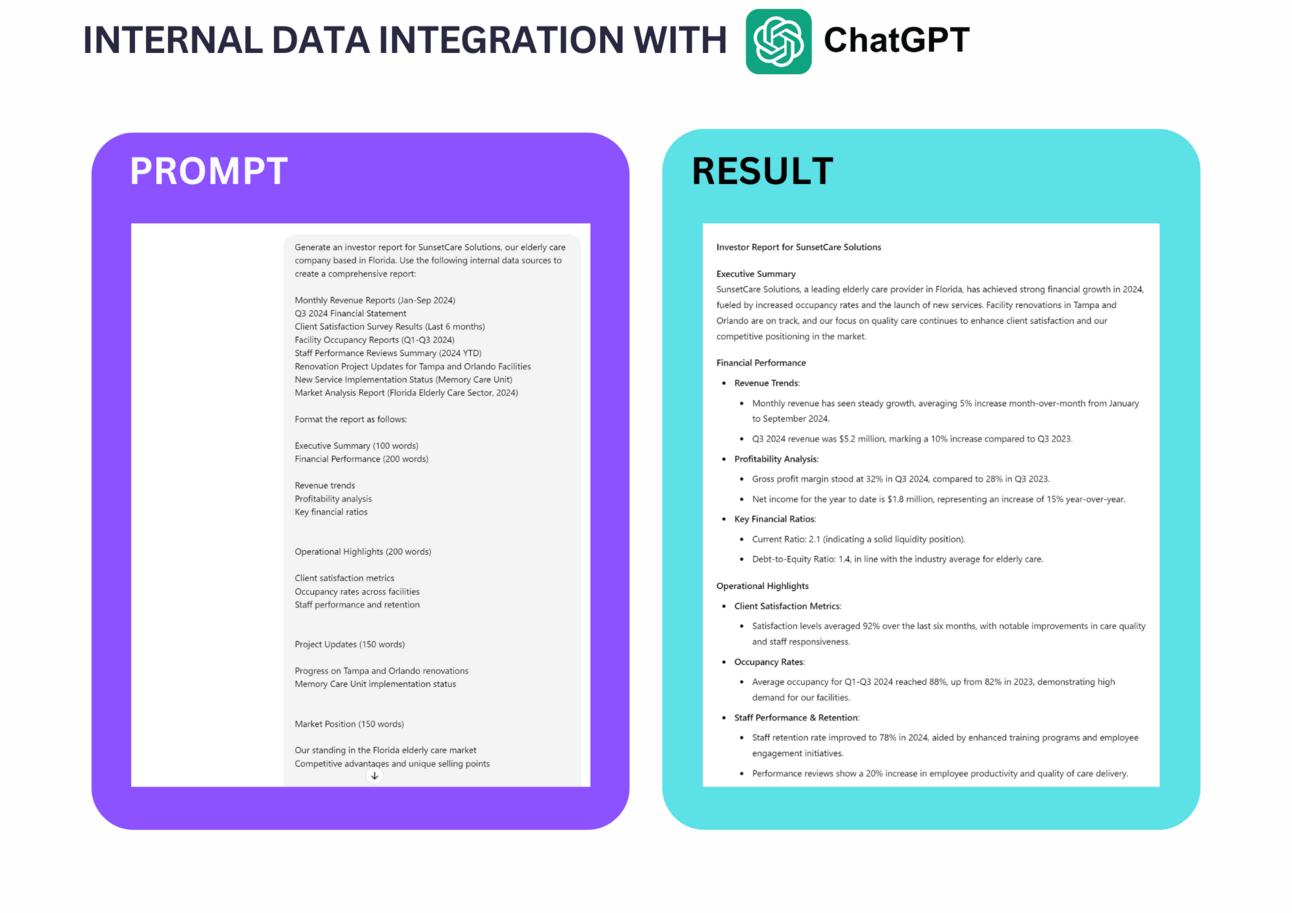 The second part of the report focused on internal company data, including sales figures, project progress, and financial metrics. We started by uploading the desired report output format into ChatGPT, along with various data sources such as PDFs, CSVs, and Excel files (most of them exported from the company's internal systems—CRM, project management software, accounting software). We then instructed ChatGPT to generate the investor report using these uploaded documents as data sources. This automated the task of consolidating and formatting data, ensuring that the report was structured exactly as needed without manual data entry.