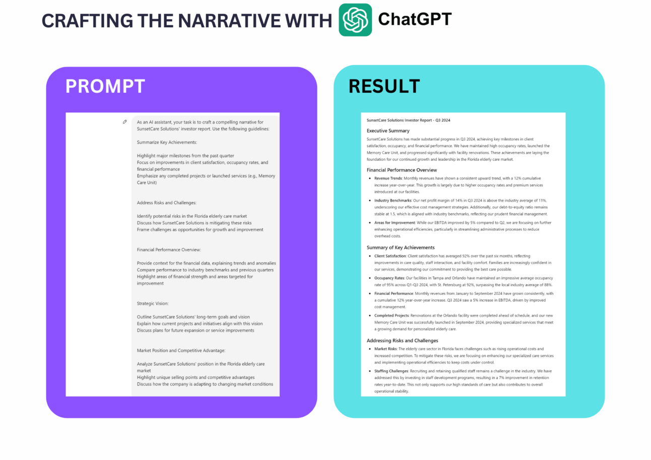 Once the data was organized, the next challenge was crafting a compelling narrative around it. We used ChatGPT to draft the narrative sections—summarizing key achievements, highlighting risks, and providing an overview of financial performance. This step ensured that investors were not just presented with raw numbers but also given context that helped them interpret the company’s progress and challenges effectively.