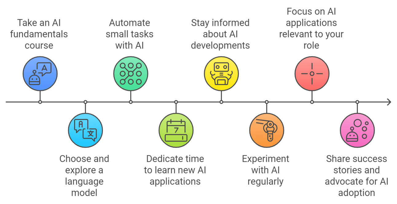 If you haven’t started, start today! Set aside some time to learn the basics. Use AI to automate a task, save time, and use that time to keep learning.